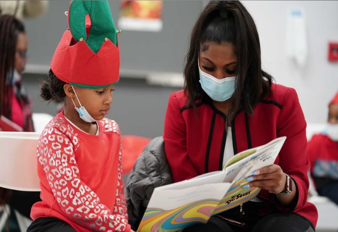 • Rasie reading to young students for the Read Along for Christmas event at Alcy Elementary